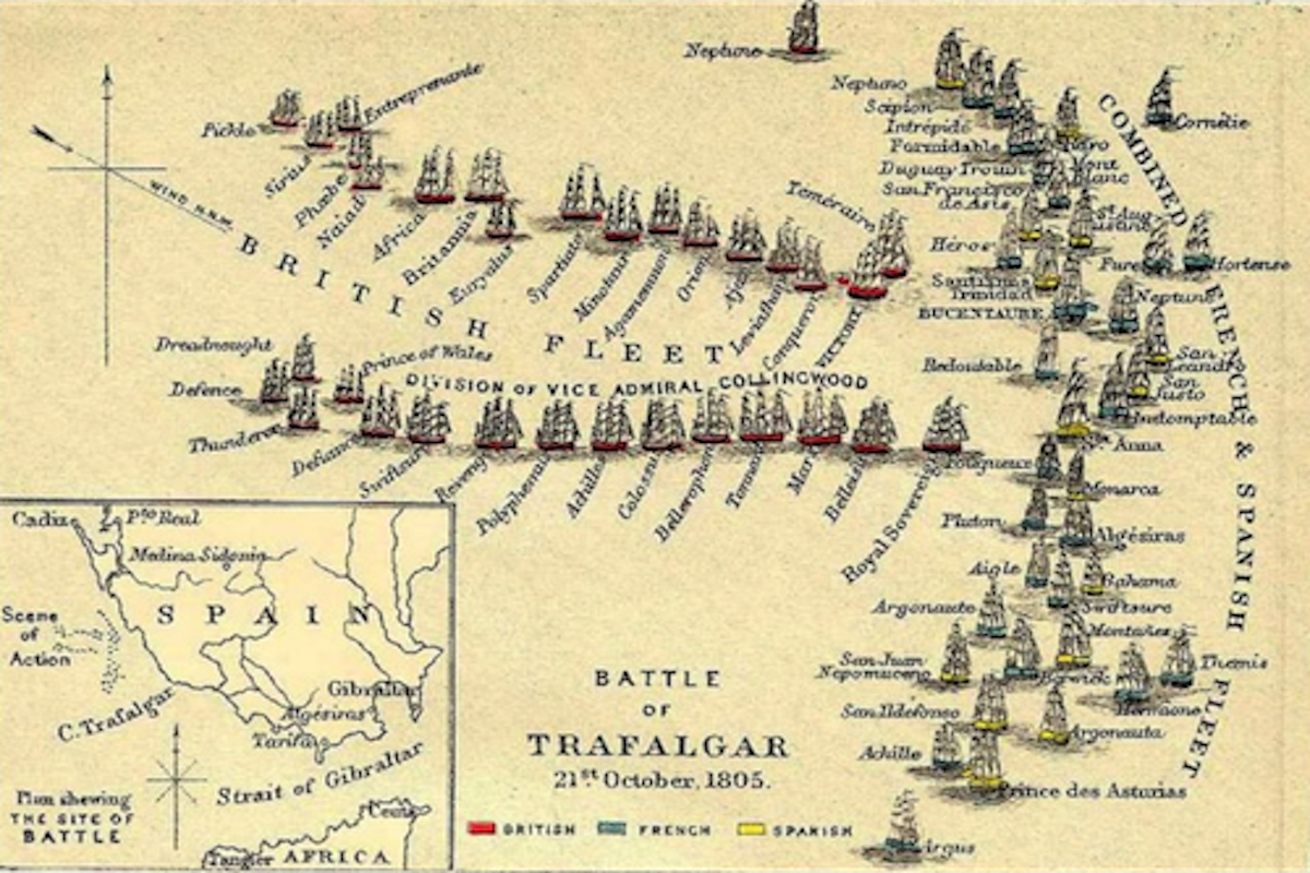 La manœuvre dirigée par Horatio Nelson fut déroutante, car contraire à la tactique habituelle de combat en mer. Au lieu de placer les navires face à face, comme en recommandait l’usage ,en deux lignes perpendiculaires au vent pour se croiser et se canonner, Nelson choisit de faire face aux colonnes de la flotte franco-espagnole, supérieur en nombre, mais avec des bateaux plus vétustes et des équipages moins entraînés. Puis de les couler systématiquement pour détruire la flotte en totalité.